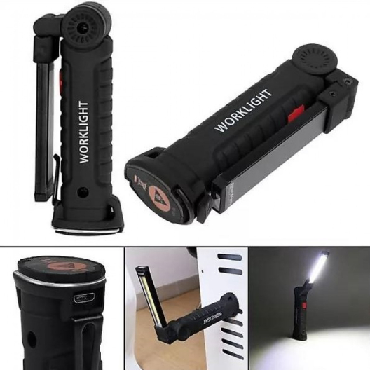 Сгъваема работна лампа за ремонтна дейност и не само. Три работни режима: 100% COB, икономичен 50% COB и LED. Олекотен пластмасов корпус с шарнирна стойка с магнитно закрепване. Има магнит в основата за лесно закрепване на метална повърхност. Сгъваема кука. Клипс за носене. Режими: LED фенер отпред и COB работна лампа отстрани. Превключване чрез изреждане с бутон в корпуса. Работи с вграден акумулатор, който се зарежда посредством приложения USB кабел, може и със зарядно за GSM microUSB. Олекотен корпус от ABS пластмаса.