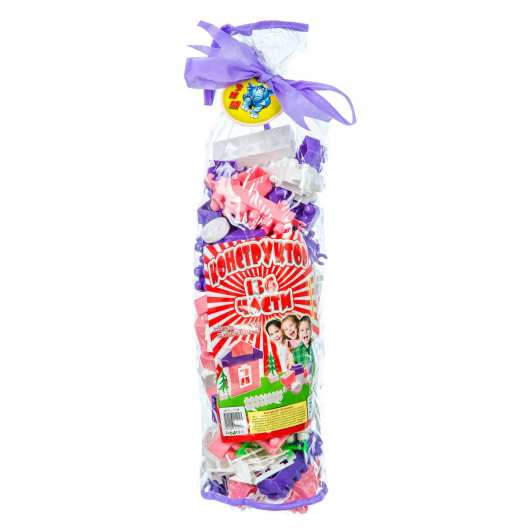 Констуктор с дребни елементи в ярки цветове – розов, лилав и бял.