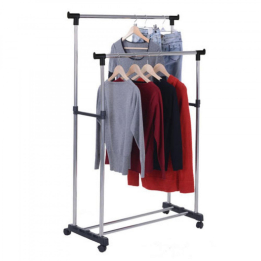Закачалка за дрехи двойна на колела може да събере повече дрехи, защото има две тръби за по - голямо удобство.