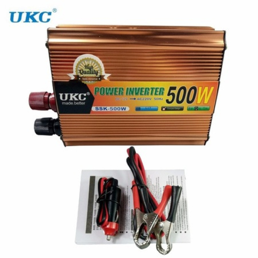 Инвертор UKC 12 V-220 V, 500W - за автомобили преобразува напрежението от акумулатора в 220 V. Без адаптери, преходници и скъпи зарядни за запалки. Вече може да включите за зареждане, Вашият телефон, таблет, лаптоп, телевизор, аудио и видео, вентилатор и друга техника. Захранване с кабел и щипки директно от акумулатора заради по-голямата мощност. Уреда има темепературана защита, мощен вентилатор който го охлажда и в най-горещите дни. Наличие на звукова сигнализация при прекалено ниско или високо входно напрежение. Предпазител отвън на уреда, за моментална смяна при нужда.