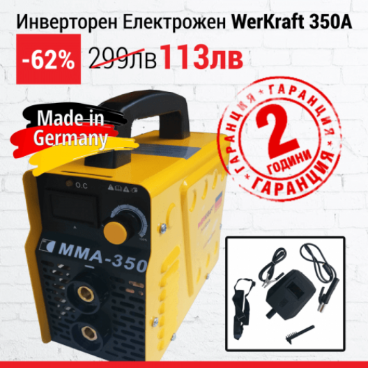 Предлагаме на Вашето внимание нови инвертони IGBT електрожени MMA 350А с дигитален дисплей. Специализирана машина за заваряване на места където другите електрожени нямат шанс,напълно водозащитен. Предназначен за извършване на прецизни заваръчни дейности с всички видове електроди (алуминии, рутил стандартен, неръждаем, чугунен и стоманен) с диаметър от 1 мм до 5 мм.
