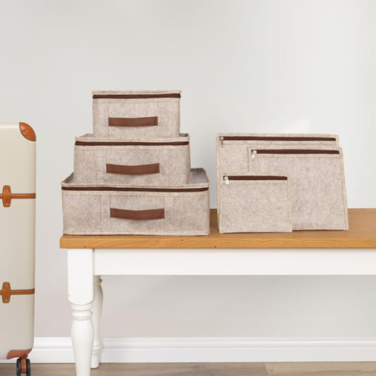 Включените в комплекта 6 органайзера с различни размери ви позволяват да подредите чистите дрехи, бельото, електрониката, козметиката и т.н. по систематичен начин. Всеки органайзер е специално проектиран, за да ви помогне лесно да разграничавате и намирате различните предмети.