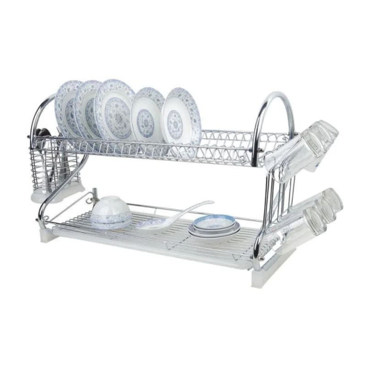 Кухненски сушилник за съдове на две нива с отделения за прибори и чаши, висококачествен хром