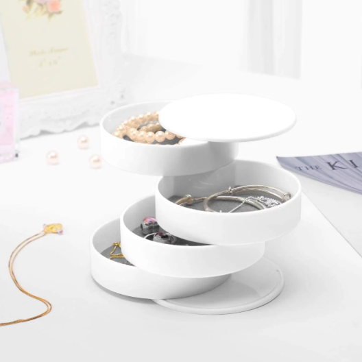 Органайзерът е идеалното решение за съхранение на разнообразни дребни предмети, благодарение на своите 4 секции. Всяка секция може да бъде използвана за различни видове предмети като бижута, козметика, шевни аксесоари и други. Кутията е проектирана с въртящ се капак, който може да се отваря и затваря лесно, като просто завъртате чекмеджето наляво или надясно. Това предоставя удобство при достъпа до съдържанието и осигурява сигурно съхранение на предметите вътре.