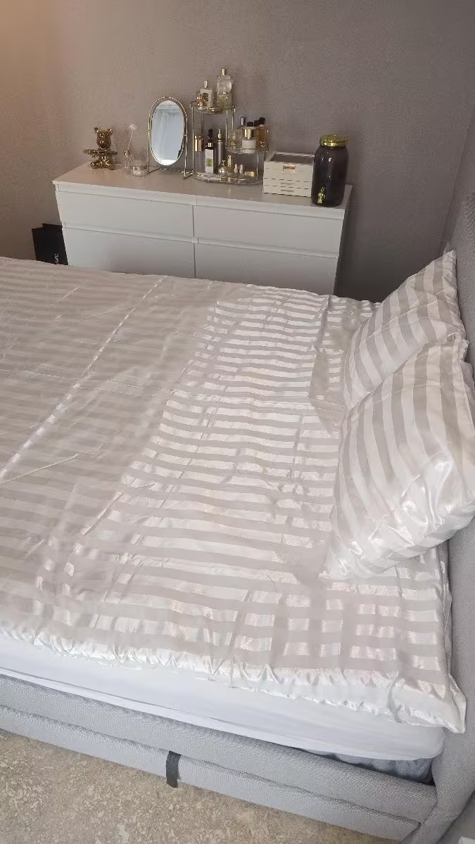 Изработен е от изключително мек, дишащ и лек тънък сатен. Външният вид на тъканта е по-мек и елегантен, като блясъка на перлата; Цветът е много ярък и прекрасен, подходящ е за декориране на спалня в луксозен и очарователен стил през всички сезони.