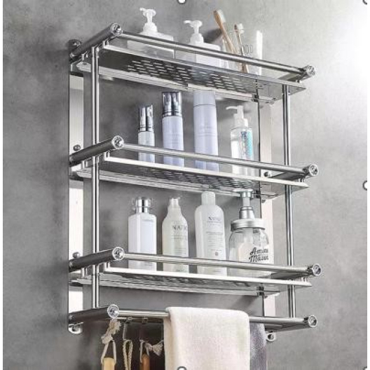 - 3 рафта за съхранение на принадлежности за баня и поставка с кукички за хавлии, дрехи, халати и т.н.