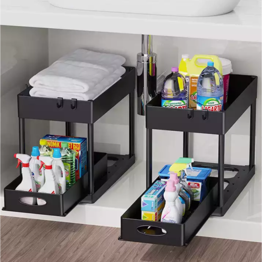 Многофункционалният плъзгащ се органайзер за шкаф разполага с горна кошница и едно плъзгащо се чекмедже, чиято цел е да реши проблема с навеждането, за да намерите нещо под мивката.