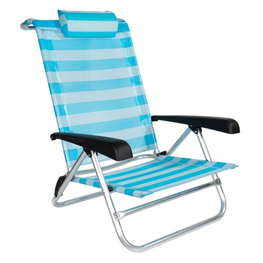 този стилен и удобен плажен стол. Той предлага отлична комбинация от комфорт, функционалност и лятна визия със своето свежо синьо райе.