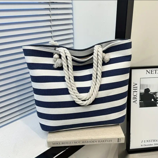 Плажна чанта с въжени дръжки в морско синьо-бяло райе