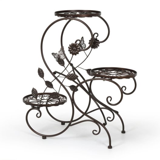 Поставка за растения ковано желязо, 3 нива, дизайн листа и пеперуди, тъмнобронзова