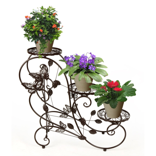Поставка за растения ковано желязо, стълбообразна с 3 нива, дизайн листа и пеперуди, тъмнобронзова