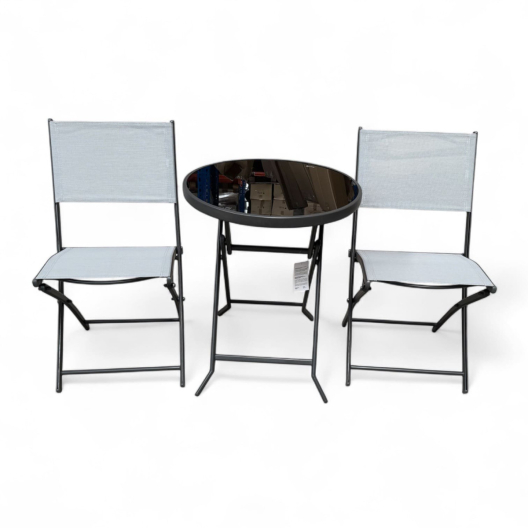 Добавете стил и удобство към вашето външно пространство с този практичен и елегантен градински комплект. Състои се от два удобни стола с текстилна седалка и облегалка, осигуряващи комфорт дори при продължително използване, и компактна кръгла маса със стъклен плот, устойчива на атмосферни влияния. Всички елементи са сгъваеми, което ги прави лесни за пренасяне и съхранение – идеални за балкон, тераса, двор или къмпинг.