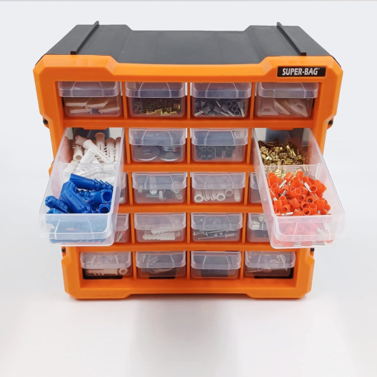 Практично решение за подредба и съхранение на дребни части, болтове, гайки, винтове и аксесоари.  Компактният размер и прозрачните чекмеджета осигуряват лесен преглед и бърз достъп до съдържанието – подходящо както за професионални работилници, така и за домашни майстори.