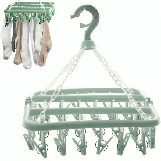 Закачалката с щипки за сушене на чорапи и бельо с 32 клипса е практично и ефективно решение за сушене на чорапи и бельо. Независимо дали се използва на балкони, тераси, у дома или в градината, този сушилник е идеален за всекидневните нужди от пране.