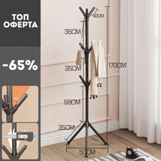 Закачалката е подходяща за палта, шапки, чанти, драхи и т.н.. С височина от 170 см. и 9 броя куки ще имате място за окачване на всичко необходимо. Цветът на закачалката е черен, а скандинавският ѝ дизайн се вписва чудесно в интериора на вески дом. Благодарение на 45-градусовия наклон на куките, дрехите ви никога няма да са паднали от закачалката.