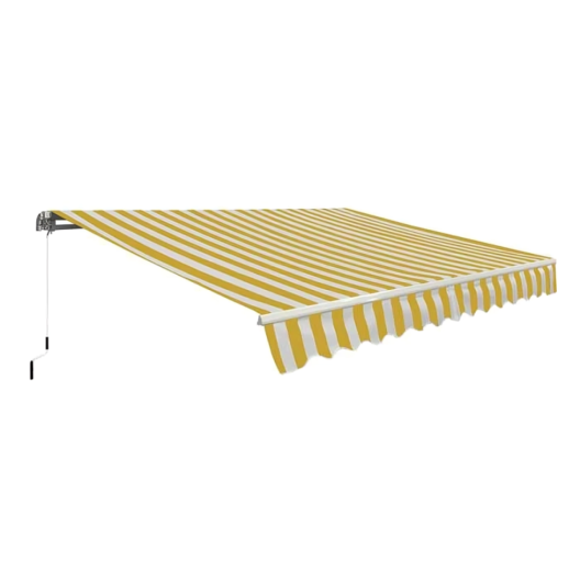 Платното на тентата е изработено от 280 гр/м2 цветен полиестер с полиакрилно покритие. Този материал е изключително издръжлив и устойчив на избледняване, като същевременно предлага отлична защита от слънце и дъжд. Платното съчетава жълт и бял цвят, създавайки свеж и привлекателен визуален ефект.